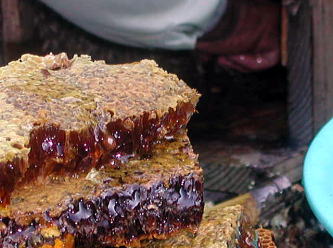 蜂の巣を切ると切り口から蜜がどろっとでてきます。 |