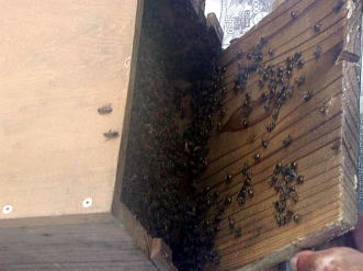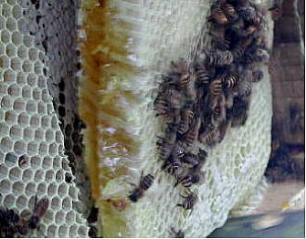 蜂の巣は、取り出しても2〜3週間もすれば、蜜蜂たちは形だけは元通りに修復します。でも、当然のことながら蜂蜜は貯まっていません。 |