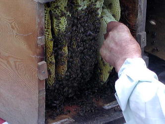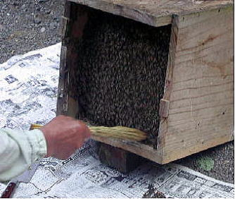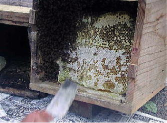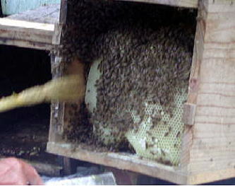 フタを開けると、みつばちたちは危険を察します。それで蜂蜜を守るためにそれぞれの蜂が腹いっぱいになるまで蜜を吸います。そこをほうきでよせていきます。 |